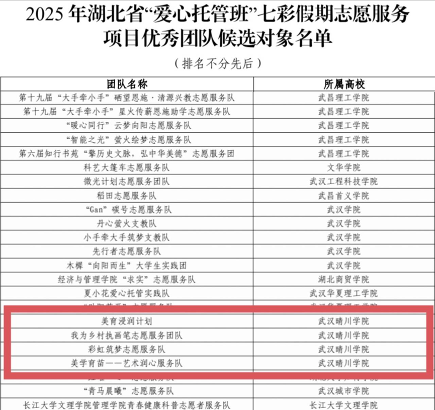喜报|武汉晴川学院4支志愿团队成功入选2025年湖北省“爱心托管班”七彩假期志愿服务项目优秀团队