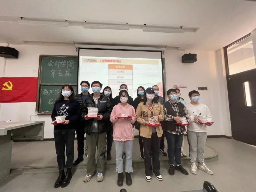 紧接着,展示上学期各班级到课率、优秀班级得主,并由孙院长、郭庆等老师为各优秀班级颁发荣誉证书和奖品。获得本次优秀班级的是会计2003、会计2004、注会1903、工管2101、工造2002、会计1902。
