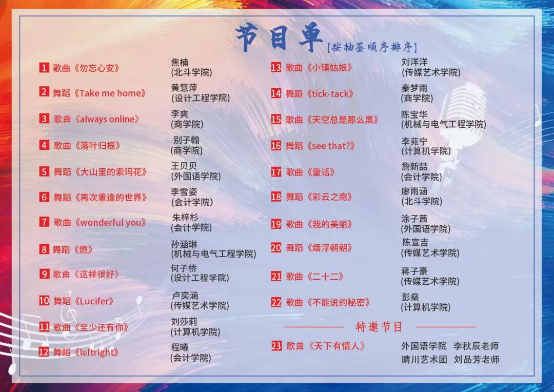 1. 焦楠 学院:北斗学院 参赛曲目:《勿忘心安》 参赛人数:2人