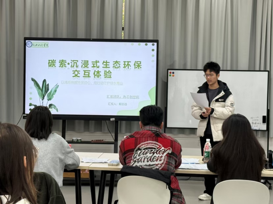 在“创意展示”环节,各团队围绕生态修复、资源循环、低碳生活等主题,提出兼具创新性与可操作性的解决方案。部分团队聚焦校园场景,设计了垃圾分类智能引导系统、旧物改造公益平台等项目,以轻量化实践推动校园绿色转型;另有团队将目光投向社会生态,围绕流域保护、生物多样性监测等方向,提出兼具学术价值与社会意义的环保方案。