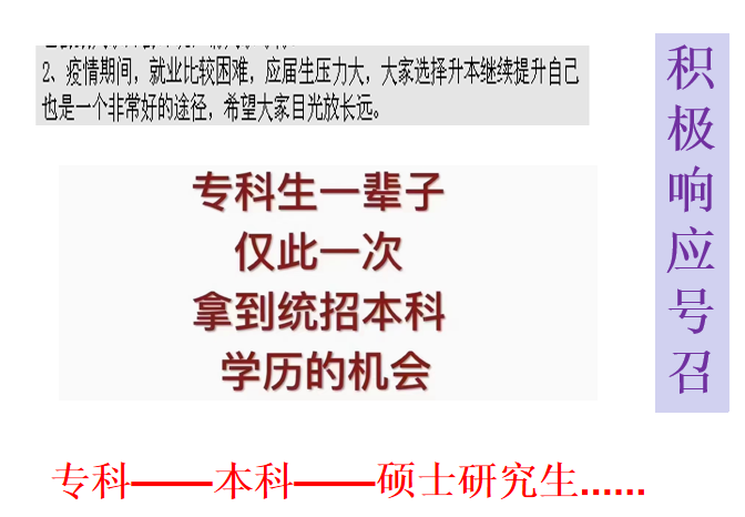 当今社会发展日新月异,对学历的要求逐年提高,各个行业都在“内卷”,专科生在就业时明显受到许多限制,报考专升本是大势所趋。另外统招专升本,专科生一生只有这一次报考机会,统招专升本相较于其他升本方式来说含金量更高,毕业时发双证。