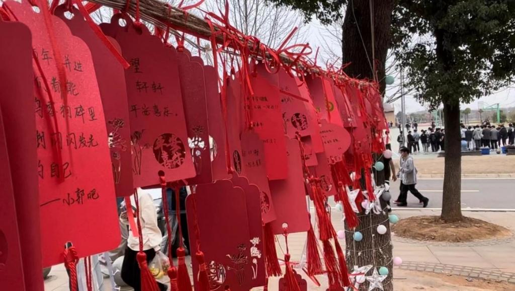 当黑暗的夜空被流星划过时,不经让人在心里暗暗许下愿望,一个愿望包含着对生活美好的憧憬。心愿树承载了同学们的这种美好憧憬,一根根红绳系着对未来的向往,对她人的祝福,对自己的激励,对家乡的思念,是同学们真情的流露。