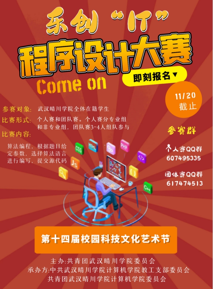 编程没有模板,只需心灯一盏。本次推迟的“乐创IT”程序设计大赛圆满结束,非常感谢参与本次比赛的晴川学子们,明年我们将以更好的姿态,更优质的题目面向大家,让我们一起进步,同攀高峰。