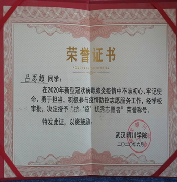 放假期间,他也没有将志愿服务落下。当疫情爆发时他主动联系当地村委会帮助给村民查体温、为村子里面消毒、采购生活物资、清理村庄生活垃圾、协助村委会整理数据资料……在这些琐事中他切实感受到了志愿服务的意义。于是,在2021年四月他参加了汉阳区民兵无人机侦察排授旗仪式,正式成为汉阳区民兵无人机侦察排的一员!虽然日常训练很辛苦,但他从来不言放弃,始终将奉献作为自己一生的追求。