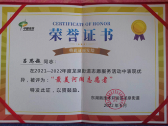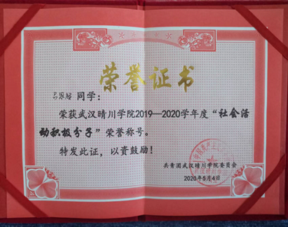 在校期间,他与“竹蜻蜓”飞行协会的小伙伴们利用自己在协会所学到的无人机知识,主动参与航空科普公益行、校地共建河湖治理、森林防火、日常巡山巡湖等志愿活动。曾荣获“最美河湖志愿者”、“社会活动积极分子”、“抗疫优秀志愿者”等荣誉称号。他将自己所学到的知识传播出去,为环境治理贡献自己的一份力量。