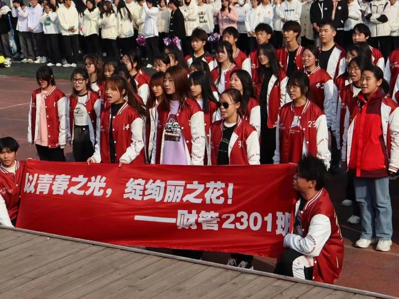 迎面走来的是财管2301班,身着中国红的衣服再配上日不落的歌曲,舞步轻盈,韵律激昂。“以青春之光,绽绚丽之花”的口号在横幅和摇旗的点缀下映入眼帘。