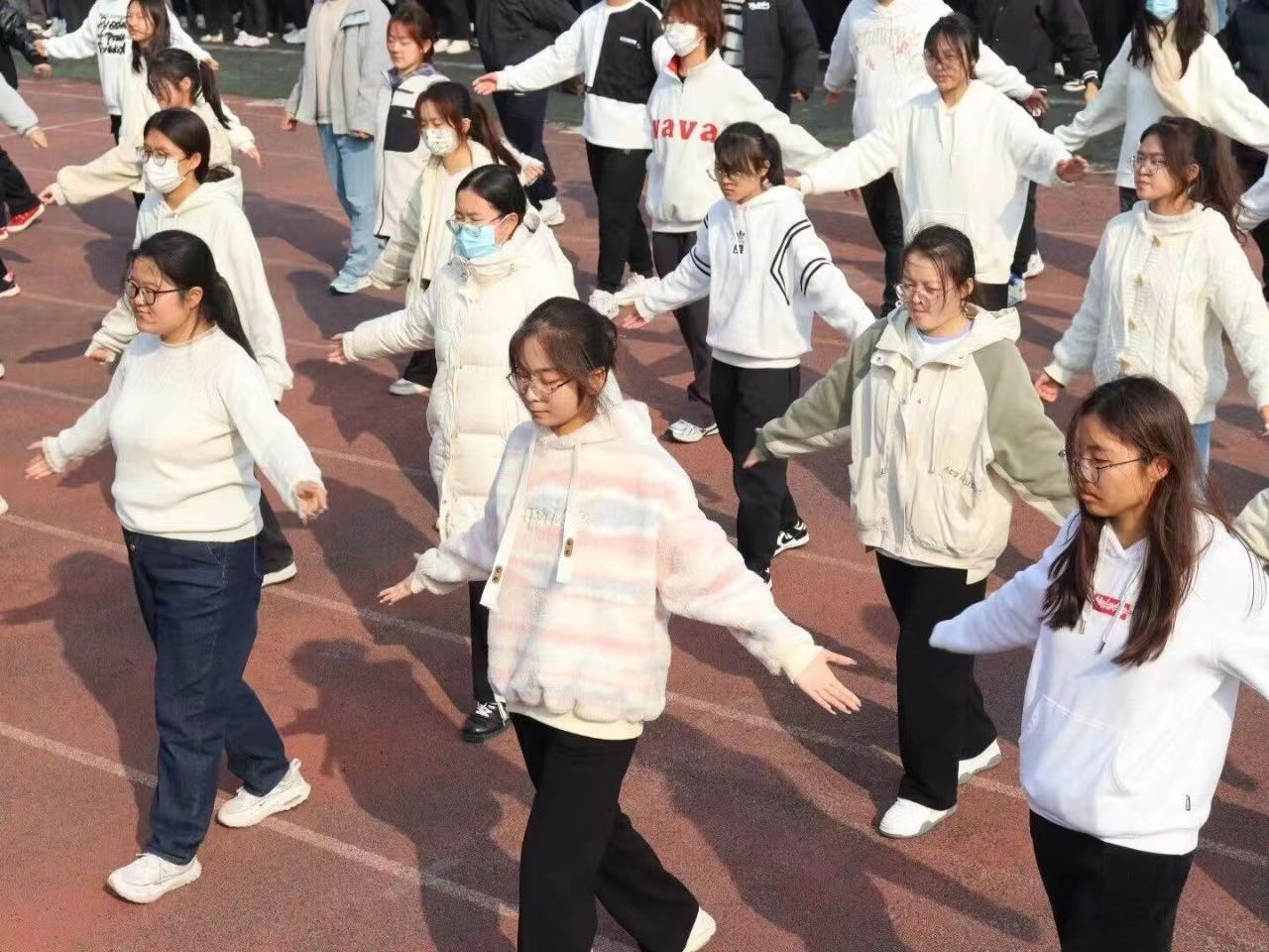 各班在班干部的带领督促下积极准备,大家利用早操运动时间认真训练,同学们斗志昂扬,以最佳的精神风貌,展示青春的靓丽风采。随着主持人宣布活动开始,各班按顺序依次上场。