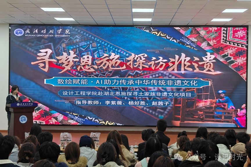余海岚同学分享了“寻梦恩施·探访非遗”社会实践的成果,团队辗转24个地点学习体验传统技艺,以设计为桥梁赋能非遗传承,将传统元素融入海报、文创及包装设计中,让古老技艺焕发新生。董阳同学分享感悟,在非遗探访过程中,团队在摸索中成长,遇到问题及时沟通,不仅加深了对传统文化的理解,更提升了协作能力。