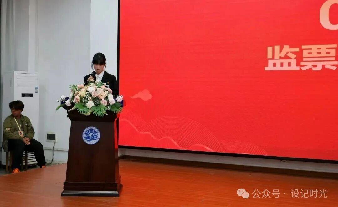 设计工程学院第八次学生代表大会筹委会监票组代表朱称莉同学,代表监票组宣誓。监票组承诺将严格遵守选举纪律,认真履行监票职责,全程监督投票、计票环节,确保选举过程公开透明、结果真实有效,维护全体代表的民主权利。