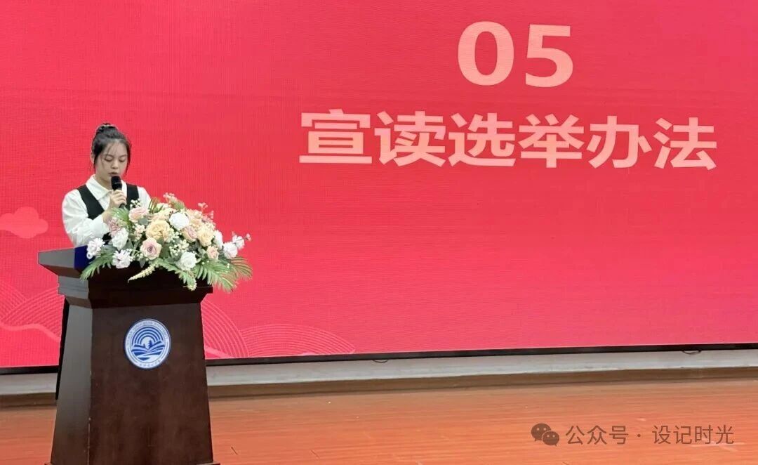 设计工程学院第八次学生代表大会筹委会代表钟文茜同学向全体与会代表宣读《设计工程学院第八次学生代表大会选举办法》,为大会选举环节的规范推进筑牢制度基础。