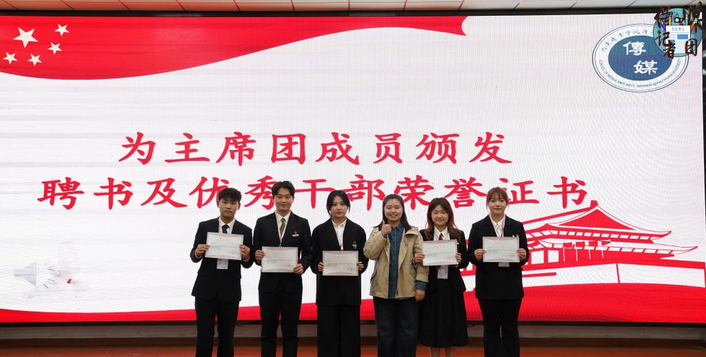 由武汉晴川学院学工处副处长张静老师为第十四届团总支、学生会主席团成员颁发聘书及优秀干部荣誉证书。