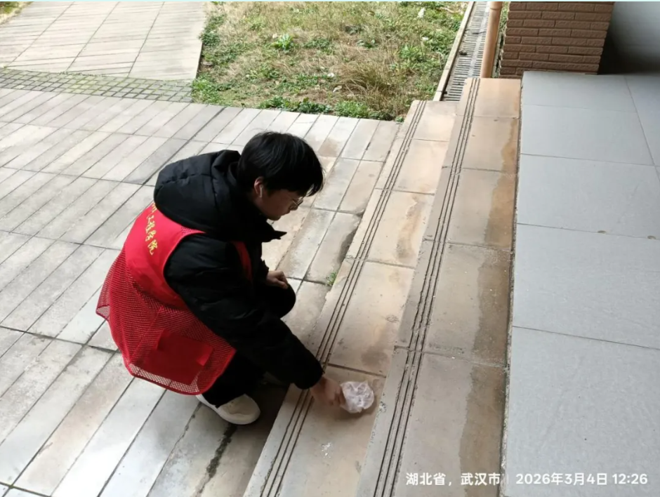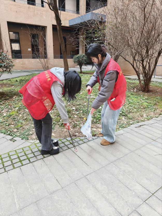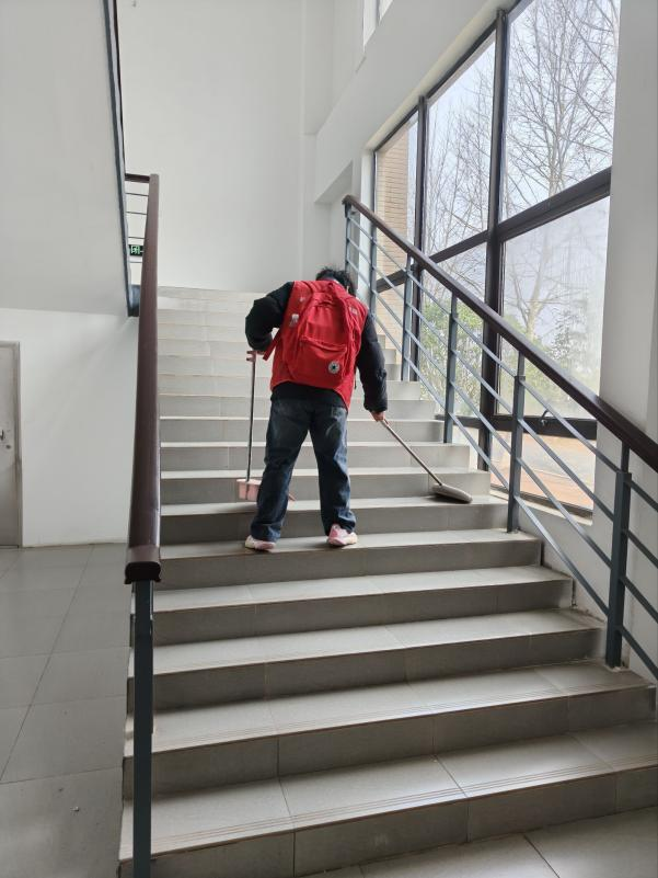 活动当天,两个团支部的同学准时在教学楼前集合,明确分工、细化责任,将清扫区域合理划分。大家自带扫帚、抹布、垃圾袋、拖把等清洁工具,迅速投入到劳动之中。教学楼内,两班同学相互配合,有的认真擦拭门窗、扶手、窗台,有的清理楼道死角的灰尘与杂物,将走廊、楼梯打扫得一尘不染;让教学楼重新焕发出整洁明亮的面貌。在教学楼一与教学楼二之间的花园区域,同学们弯腰捡拾草坪上的纸屑、塑料袋、烟头、落叶等垃圾,不放过任何一个卫生死角。大家分工协作,配合默契、干劲十足。
