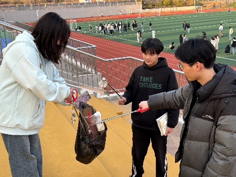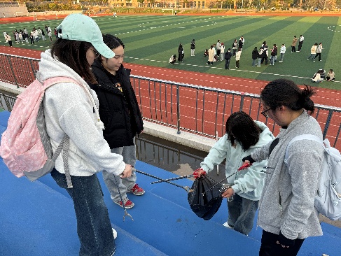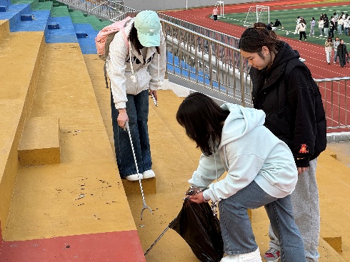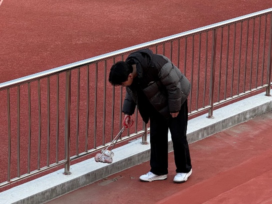 活动伊始,全体志愿者在指导老师的统筹下完成分组列队,明确分工与区域划分后,有序领取垃圾夹、环保袋、扫帚等劳动工具,迅速前往各自责任区域开展作业。本次实践覆盖四大核心区域,各小组结合场地特点精准施策:第一组聚焦操场草地,俯身细致清理草丛中隐匿的塑料包装、纸屑等杂物,兼顾草坪植被保护,避免破坏校园生态;第二组负责操场上方看台,重点清理座位间隙、扶手缝隙等卫生死角的积存垃圾与灰尘,确保设施整洁;第三组奔赴操场四周草坪与跑道,针对塑胶颗粒间的烟头、瓶盖等细小垃圾开展“地毯式”清理,同时维护跑道周边环境秩序;第四组前往樱花小路旁边草坪,专注捡拾落叶与杂物,守护樱花景观带的整洁美观。