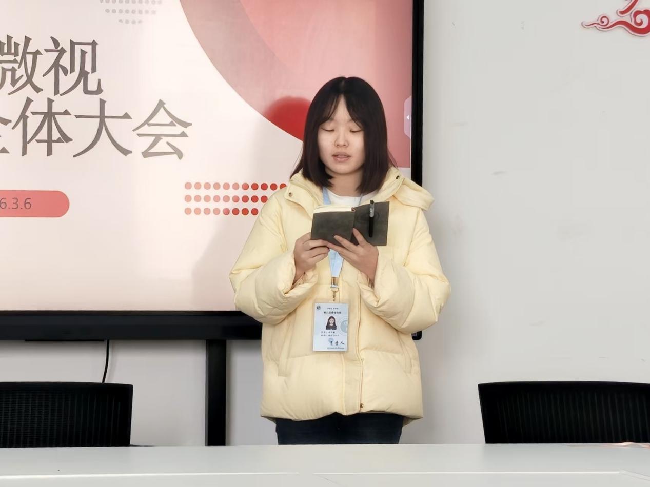 部员代表冯紫琳同学围绕上学期 15 部作品的传播数据展开复盘,明确了变装、校园采访等互动向内容更受认可的规律,提炼出 “贴合平台热点 + 创新剪辑 + 深度校园互动” 的高赞内容逻辑,同时指出当前内容缺乏清晰体系的短板,提出了个人出镜、校园活动、节日祝福三类内容的分类规划方向,鼓励原创剧本创作,在肯定成员付出的基础上号召大家新学期持续创新、再接再厉,推动账号向更规范、更优质的方向发展。