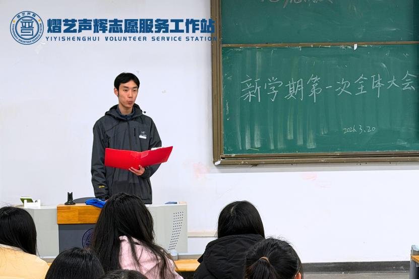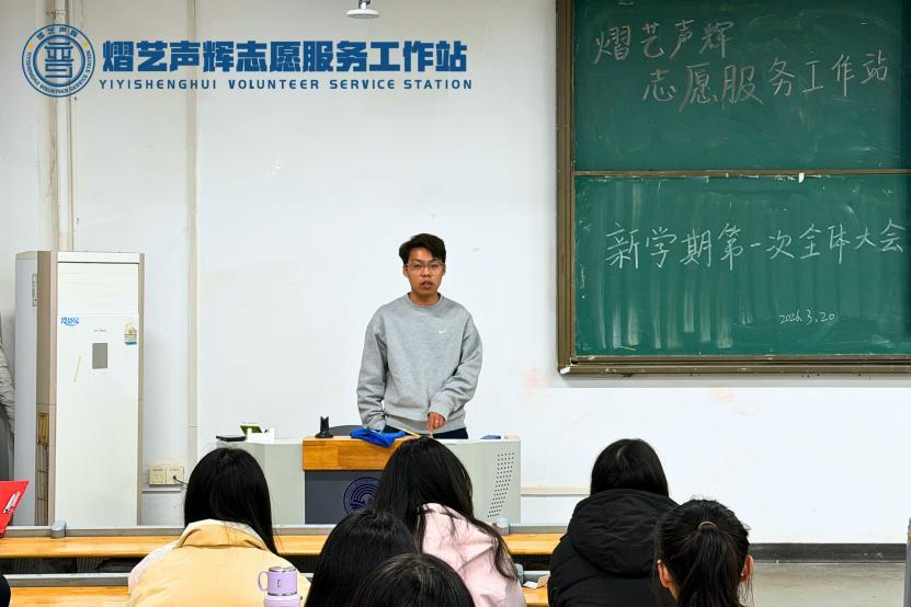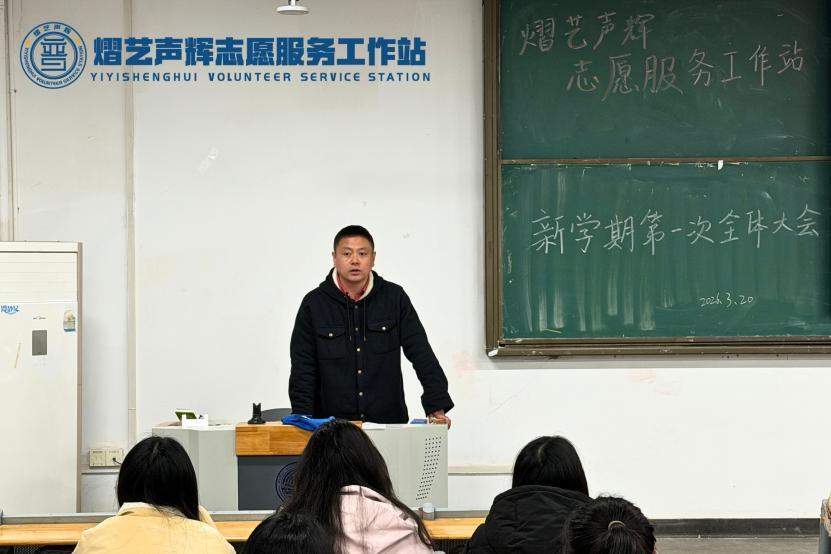 春意正好,万象更新。为总结寒假志愿服务成效,明确新学期发展方向,部署重点项目与队伍建设任务,2026年3月20日,武汉晴川学院熠艺声辉志愿服务工作站新学期第一次全体大会顺利召开。传媒艺术学院党总支书记赵锐、工作站指导老师王凯出席会议,工作站全体成员参会,大会由刘恒羽同学主持。