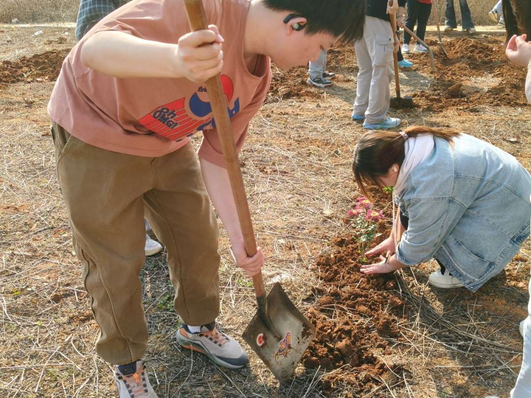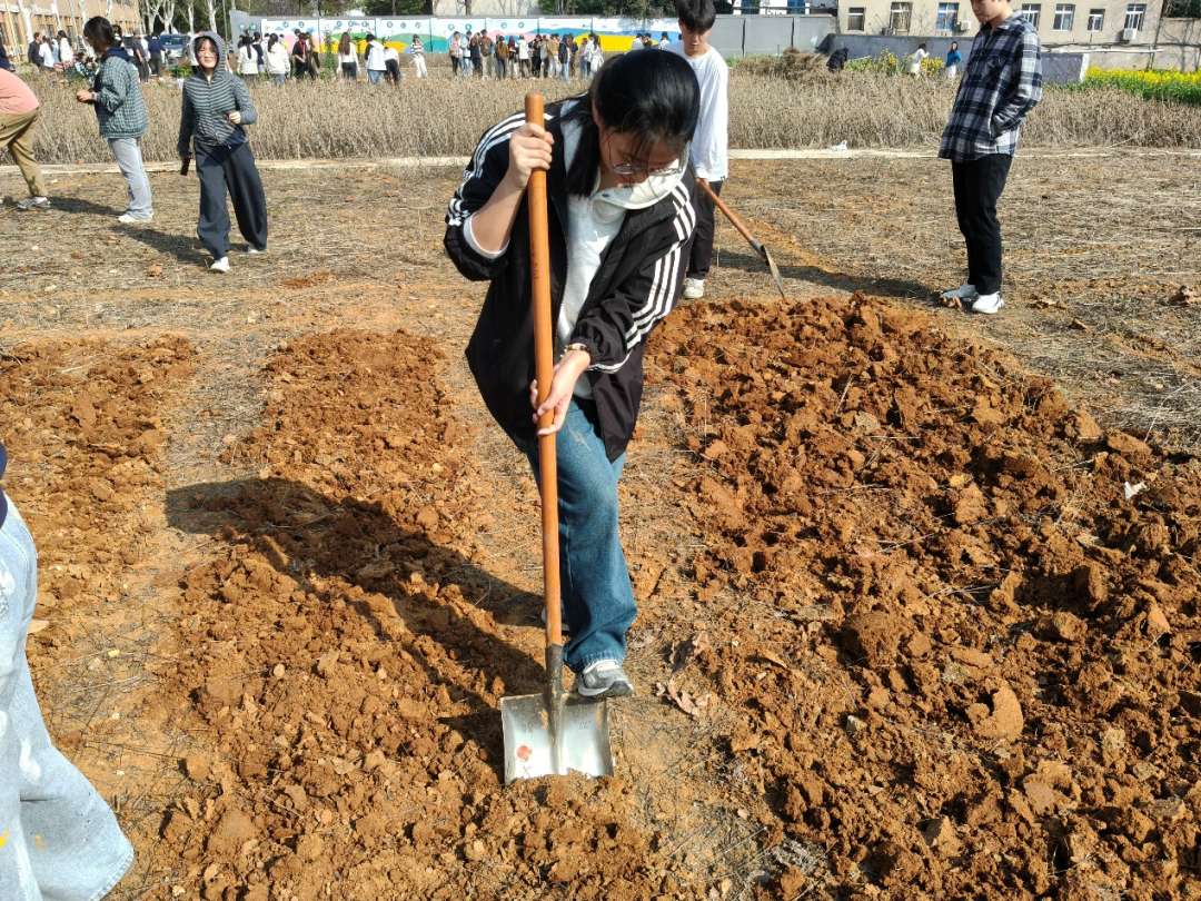 之后,同学们也纷纷开始挥动手臂,额角沁着汗珠却眼神专注,铁锹切入泥土的“沙沙”声,是青春与土地对话的韵律。