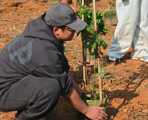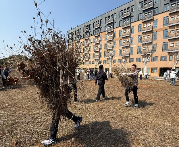 活动正式开始后,大家迅速投入到清理枯草的工作中。大家戴好手套,成群地分散在种植区域,仔细地将枯黄的杂草逐一拔除、收拢。大家配合默契,有的弯腰捡拾,有的负责搬运,不一会儿,原本杂乱的地面就变得整洁开阔,为不久的植树环节腾出了充足的空间。