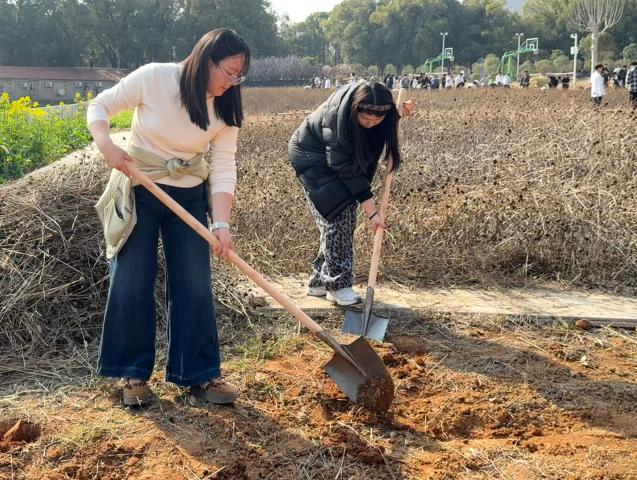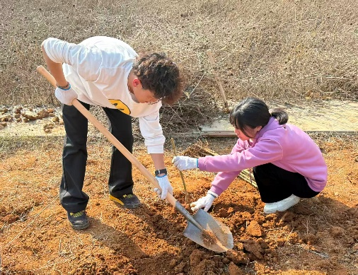 清理工作完成后,大家拿起铁锹、锄头和铲子等工具开始进行松土和挖坑作业。志愿者们俯身用力,将板结的土壤一点点翻松。汗水顺着额头滑落,浸湿了衣衫,但大家的动作依旧熟练而有力,每一下挥动都充满了力量。