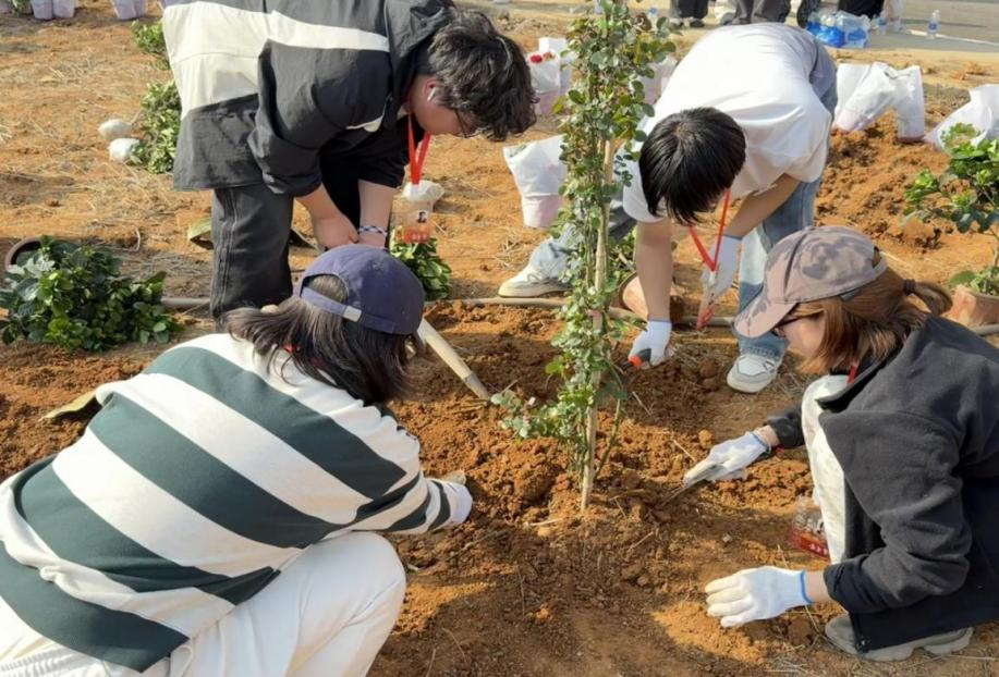 树坑挖好后,大家相互配合、默契协作。一人稳稳扶正树苗,保证树苗挺拔端正;另一人细心填土、轻轻踩实,让树苗牢牢扎根。大家用心呵护每一株新苗,用行动种下春日的希望。