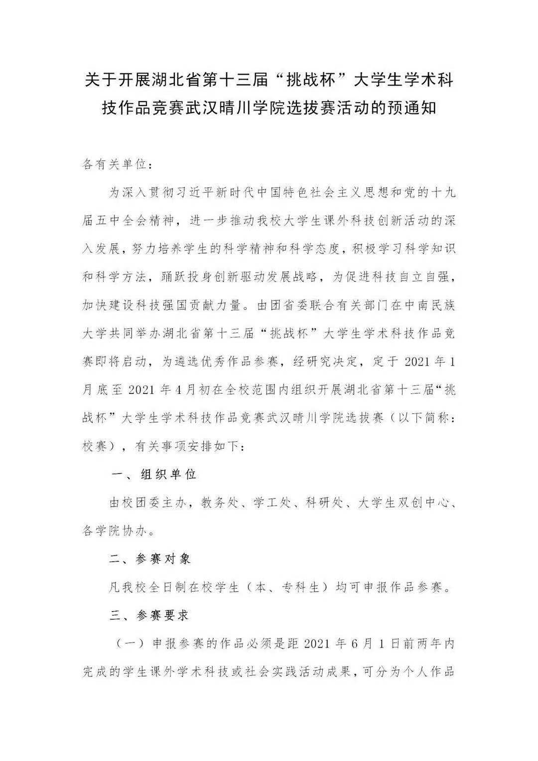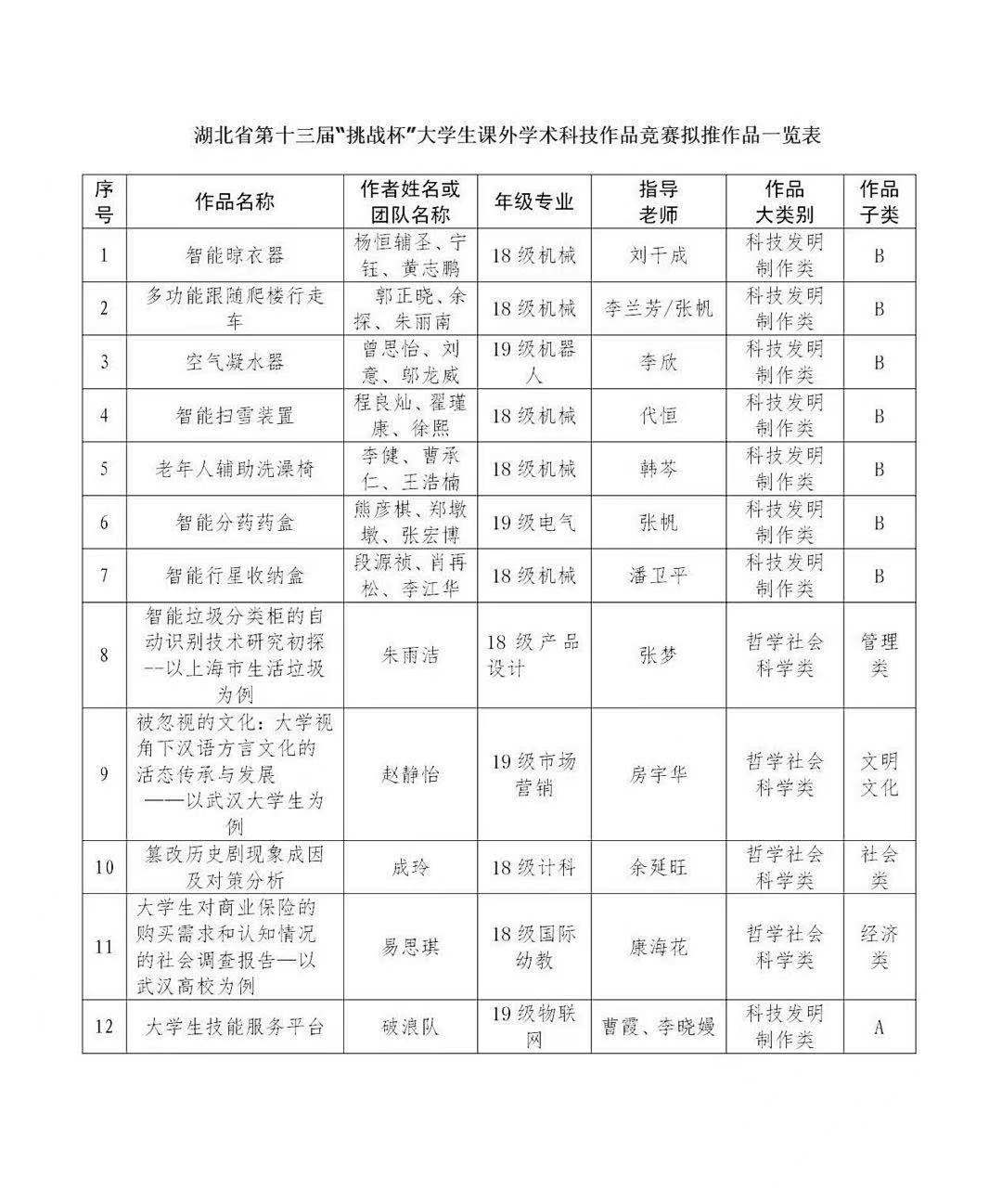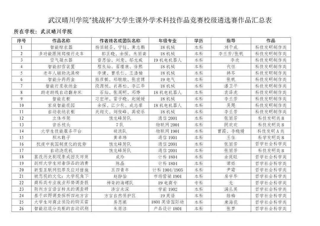按照湖北省第十三届“挑战杯”大学生课外学术科技作品竞赛通知要求,校团委于1月公布竞赛方案、发布赛事通知,各学院积极响应。经过宣传报道、组织报名、学院选拔后,我校共收到推荐校级作品104件,涵盖了哲学社会科学类社会调查报告、学术论文和科技发明制作类等各方面。