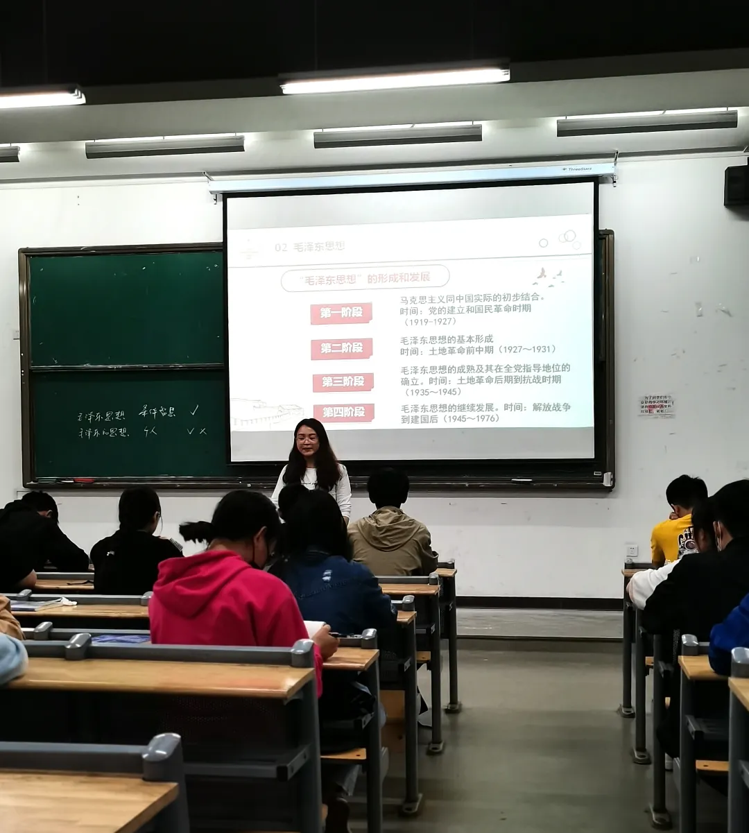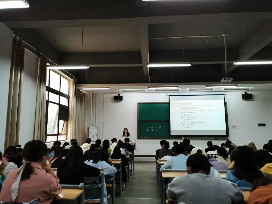 从曙光般的毛泽东思想到开启新习近平新时代中国特色社会主义思想,桂姗老师依照不同思想的时间顺序,结合具体的时代背景和相关历史事件,介绍了这些思想出现的契机、具体内容以及独特的时代意义,让学生们知其然,亦知其所以然。桂老师饱含激情的讲解,亦使会场的学习气氛愈加浓厚。