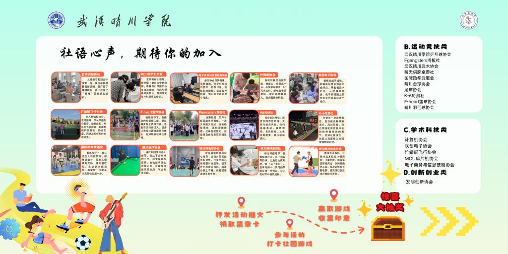 至此,第十四届社团游园会在欢声笑语中圆满落幕。此次活动不仅为晴川学子搭建了展示自我、交流协作的平台,更以社团为载体,将文化传承、科技探索、艺术表达与体育精神深度融入校园生活,进一步浓厚了校园文化氛围,推动学生社团向多样化、特色化方向发展。最后,我校团委衷心祝愿每一位同学都能在此找到热爱的方向,在多彩社团活动中实现自身德、智、体、美、劳全面发展,携手助力校园文化建设,共同绘就校园文化新图景!