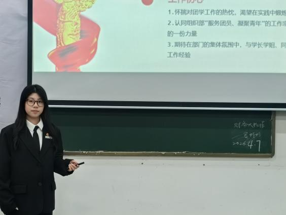 2026年4月8日下午2:00,武汉晴川学院学生代表大会候选人暨团委学生团干部选聘竞选于教4-113顺利进行。经个人申请、公开报名、学院资格审查等程序,共21名同学参加第一轮竞选。