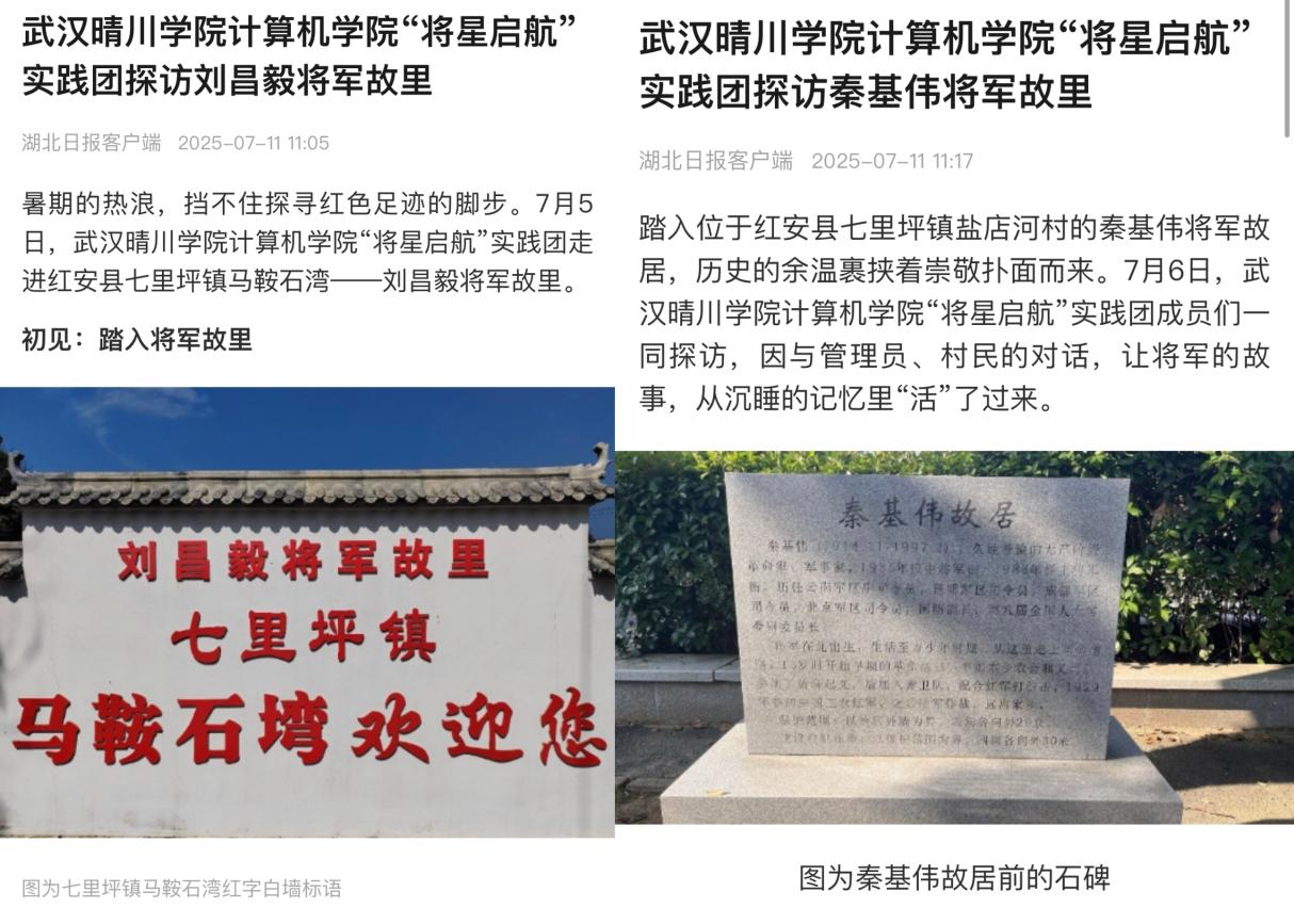 武汉晴川学院计算机学院“将星启航”实践团队肩负“传承红色基因,助力乡村振兴”的使命,在红安县开展了一系列实践活动,其扎实成果获湖北日报、长江网等十余家媒体关注报道,为青年红色筑梦之旅提供了生动范例。团队先后走访城关镇、七里坪镇等多地,参观黄麻起义纪念馆、长胜街等革命旧址,走进秦基伟等将军故居,并与当地居民深入交流,聆听并记录那段烽火岁月。结合专业优势,团队精心制作“红色记忆”系列新媒体内容与红色景点互动地图,以数字技术为红色文旅发展注入新活力。此次实践不仅是一次深刻的思想洗礼,也是一堂走进现实的“大思政课”,充分展现了新时代青年在传承红色基因、助力乡村振兴中的责任担当与创新力量。